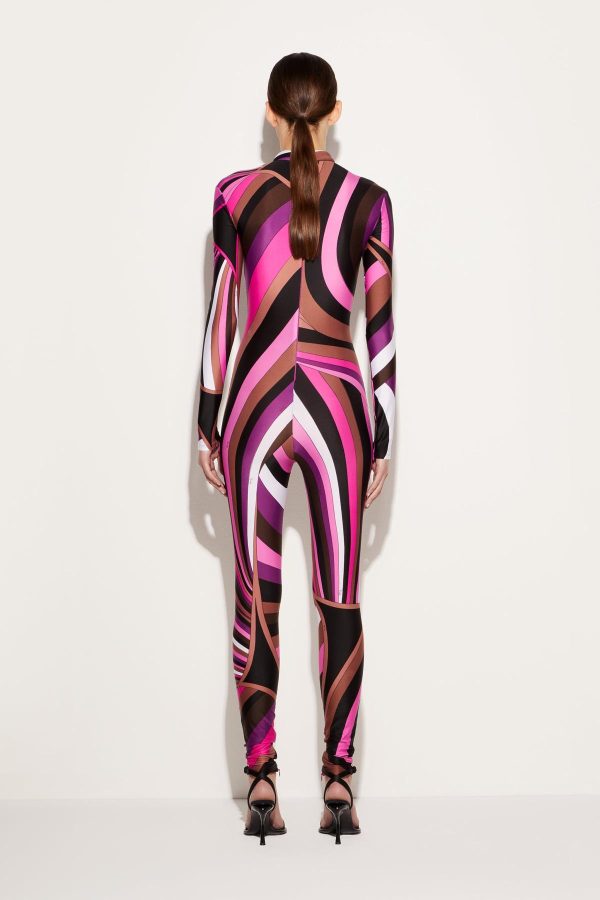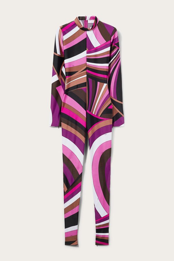 Camille Miceli takes Pucci’s maximalism to new heights with this catsuit. It’s cut from stretch Lycra to a bodycon silhouette and drenched in the Iride print’s rays in pink and purple hues.