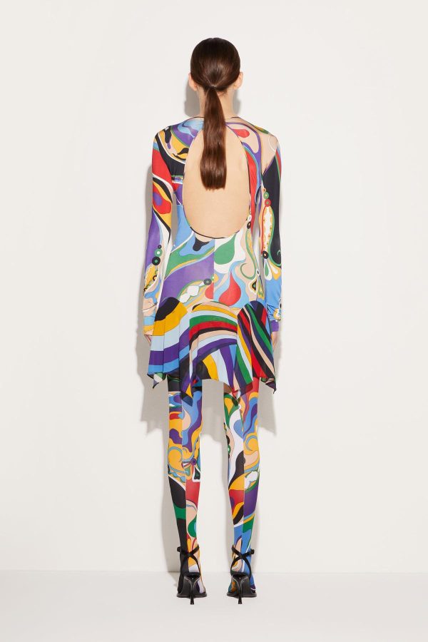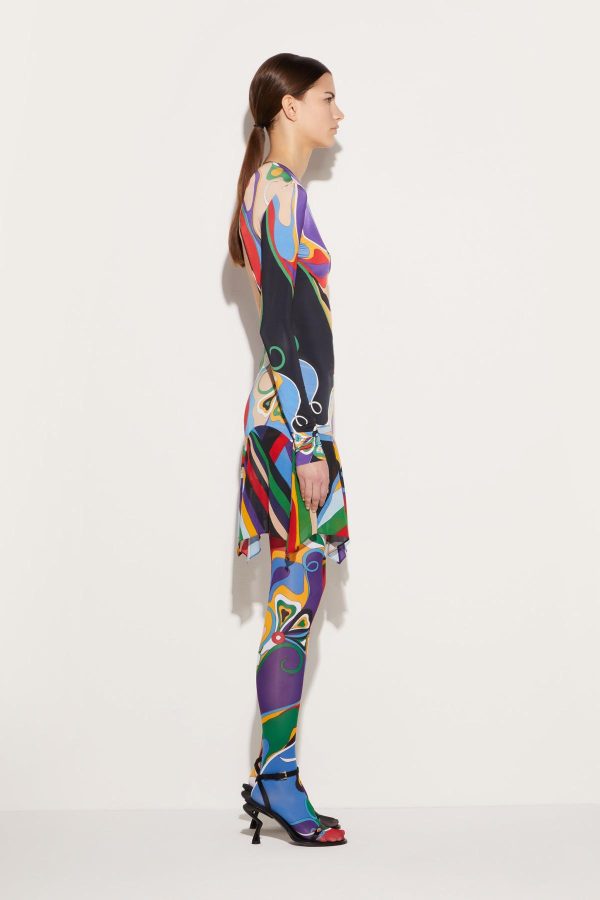 Camille Miceli designs this dress for dynamic impact: its fitted bodice falls to a fluid handkerchief hem skirt that moves with the wearer. The Orchidee print covers the jersey-satin design in swirls of colour.