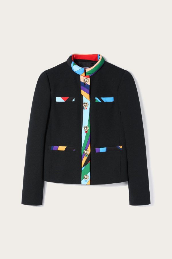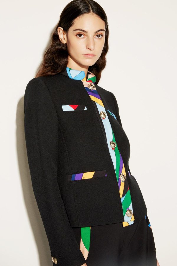 Pucci’s tailoring expertise and distinctive aesthetic come to the fore in this jacket. A classic boxy silhouette, it features Iride-print trims and gold-tone buttons engraved with the house’s storied Marmo print.