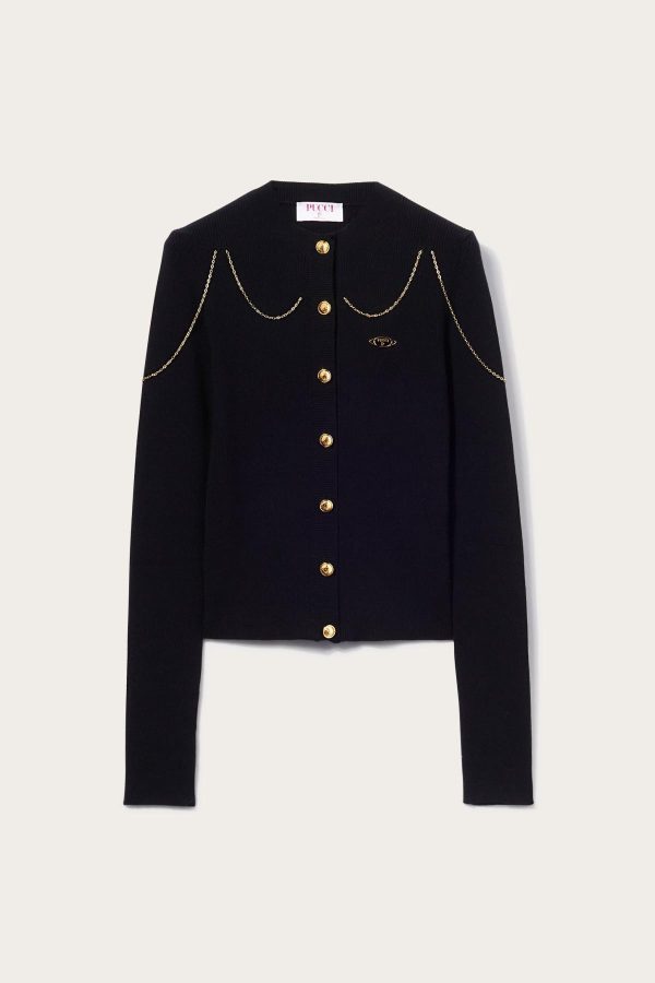 Pucci puts an unexpected twist on the classic cardigan with this style: it’s strung with a slim mariner chain that drapes across the shoulders. An enamelled logo plaque at the front completes the design.