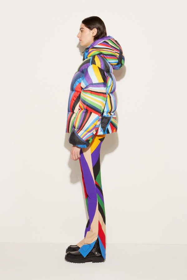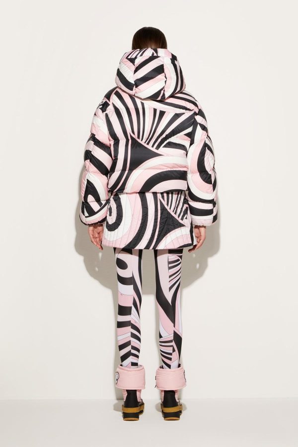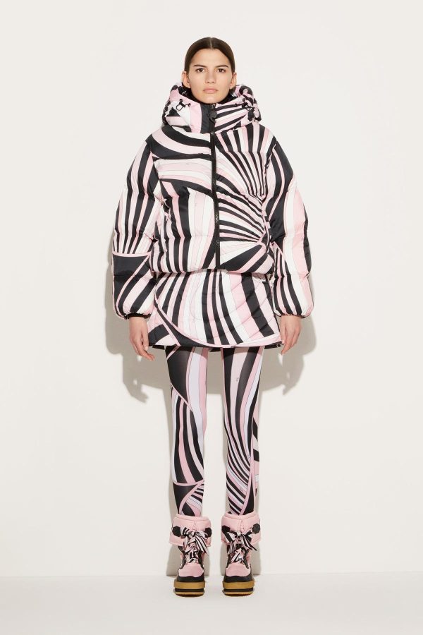 Emboldened by Pucci’s signature pattern play, this jacket is covered with the Iride print in high-contrast white, black and pastel pink. It’s made from a technical fabric and padded for extra warmth, with an integrated hood and funnel neck to block out cold and lock in heat.