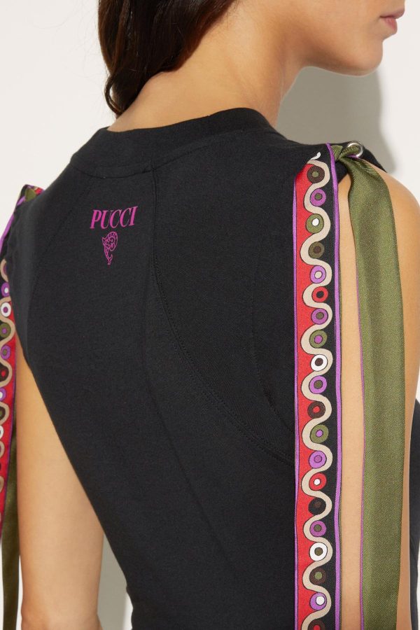 This T-shirt is an ode to Pucci’s storied scarves: it’s threaded with Iride-print ties at the shoulders. The house’s moniker and intertwined fish motif stamp the back.